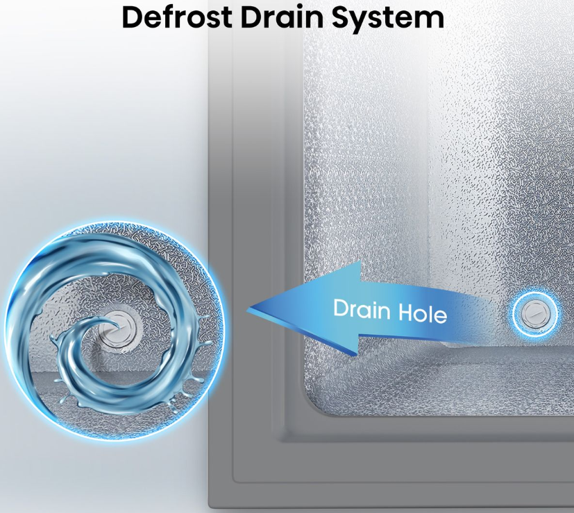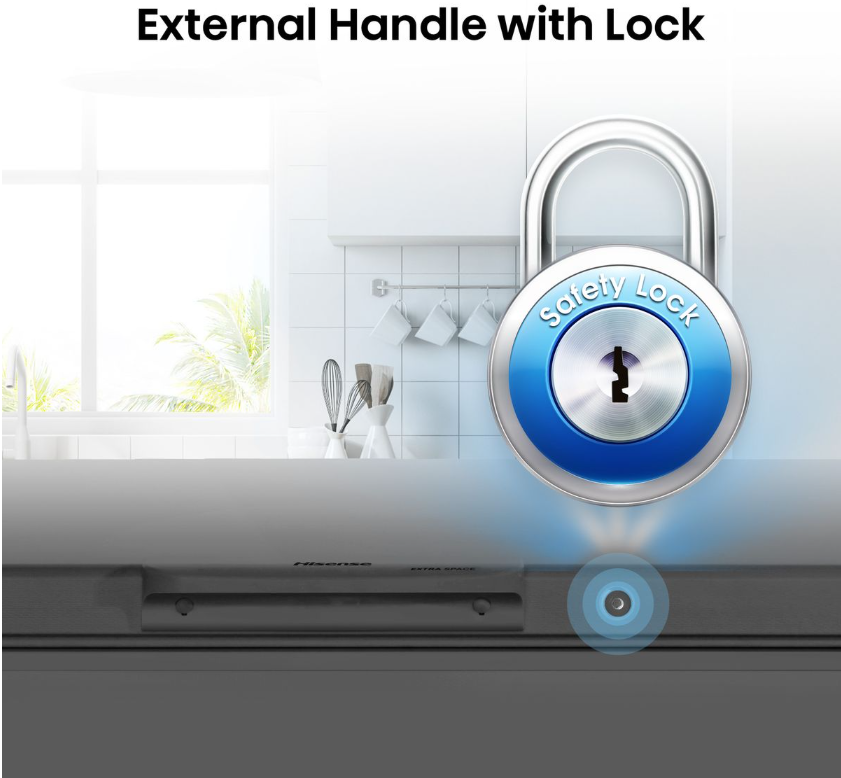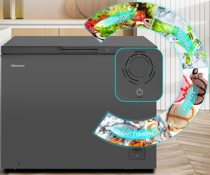 Hisense Metallic Silver Chest Freezer - 245L Net Capacity, a energy rating, soft closing door, fast freeze function, aluminum interior, external handle with lock, defrost drain system, low noise 41dB, 4 star freezer, 360 degree Cooling, high insulation door seal, and 1 year warranty